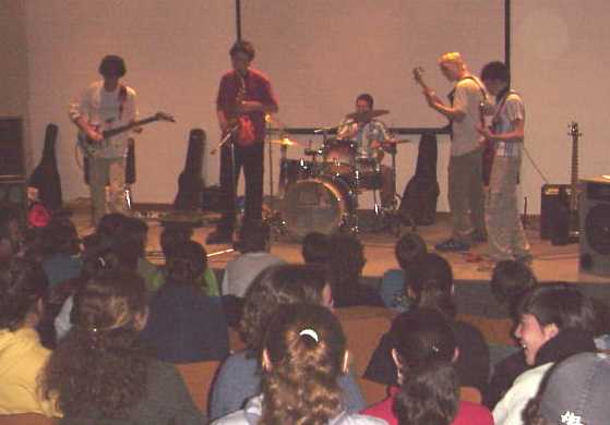 Puerto Madryn, mayo de 2002. La Peatonal toca en el Ecocentro, Santiago Novoa en viola (izquierda), Matias Guaņabens en saxo y Juan Viņas (derecha)