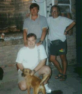 Puerto Madryn, febrero de 2000. Carolo, Sergio y Carlos en lo de Viñas, preparados para comer un corderito patagónico. Colado el Choco esperando un hueso.